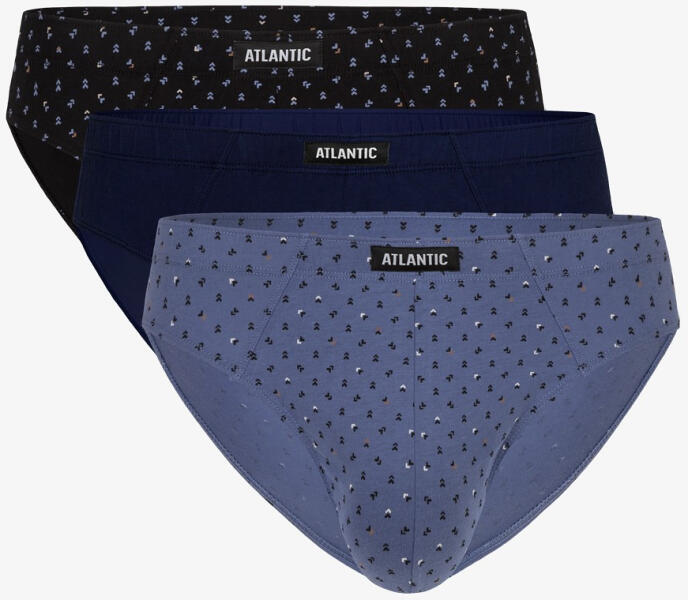 Férfi rövidnadrág Kellemes és légies pamut Alacsony vágás viszonylag mélyen vágott oldalakkal Öv puha, nem nyomó gumiszalaggal Patch ATLANTIC logóval Tökéletesen illeszkedik a testhez 3 darabba csomagolva: kettő finom mintával, egy sima Összetétel: 100% pamut