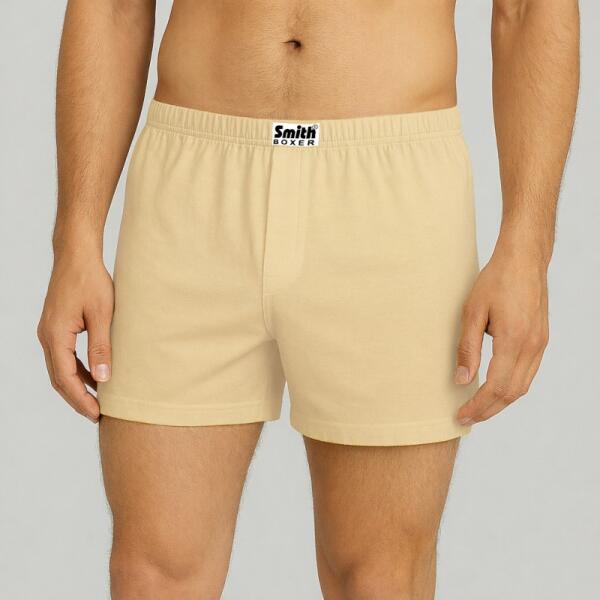 Minőségi 100% pamutból készült drapp férfi boxeralsó Ökotex Standard 100 tanúsítással, pamuttal borított derékgumival és klasszikus szabással. Ideális választás kényelmes, légáteresztő alapdarabként a mindennapi használatra