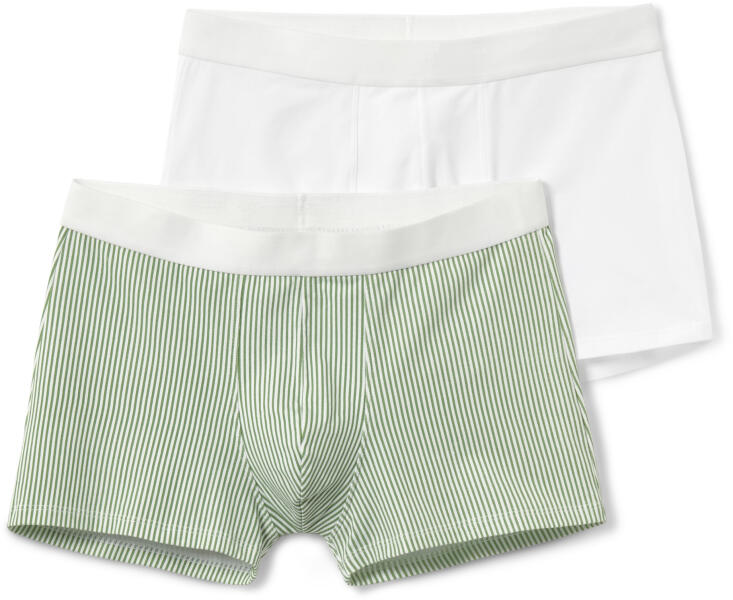 2 férfi boxer alsónadrág, csíkos/fehér Szín: 1 x fehér, 1 x olívazöld-fehér csíkos Anyag: 95% pamut, 5% elasztán (Creora®) Férfi alsónadrágok rugalmas, kényelmes derékrésszelKétrétegű elülső betoldásMárkás elasztánnal: formatartók, tökéletesen állnak, rendkívül kényelmes viseletTartós pamuttalEzek a boxeralsók elősegítik a fenntartható gyapottermesztést.