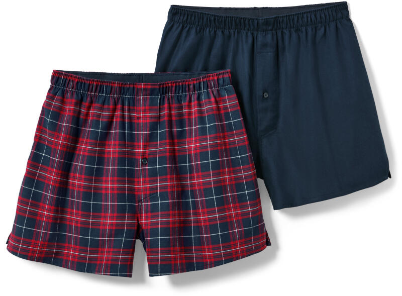 2 férfi flanel boxeralsó, kockás/sötétkék Szín: 1x sötétkék, 1x sötétkék-bordó-krémszínű kockás Anyag: 100% pamut (támogatja a Cotton made in Africa kezdeményezést) Rugalmas, lapos, kényelmes derékrészFérfi alsónadrágok gombos sliccelOldalhasítékokTiszta, szövött pamutbólTámogatja a Cotton made in Africa kezdeményezéstEzek a boxeralsók támogatják a termelőket.