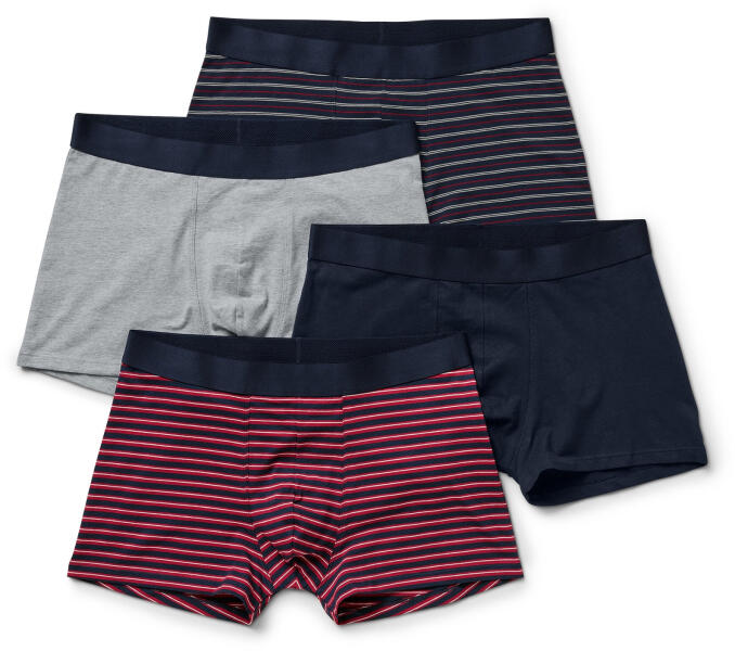 4 boxeralsó Szín: 2x kék-piros-fehér csíkos, 1x melírozott szürke, 1x sötétkék Anyag: 95% pamut, 5% elasztán (Creora®) Rugalmas, puha, kényelmes derékpántKétrétegű elülső betétMárkás elasztánnal: formatartó, tökéletesen áll, rendkívül kényelmes viselet Tartós pamuttalGOTS organic – konverziós anyagokból, CU 809415 tanúsítottEzek a boxeralsók elősegítik a fenntartható gyapottermesztést.