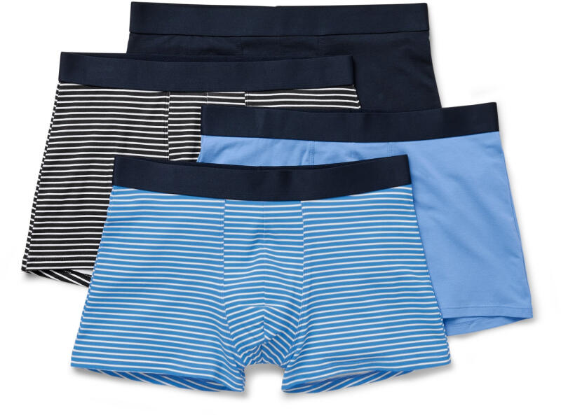 4 db férfi boxer alsónadrág, csíkos/kék Szín: 1x sötétkék, 1x kék, 1x kék-fehér csíkos, 1x sötétkék-fehér csíkos Anyag: 95% pamut, 5% elasztán (Creora®) Férfi alsónadrágok rugalmas, kényelmes derékpánttalKétrétegű elülső betétMárkás elasztánnal: formatartó, tökéletesen áll, rendkívül kényelmes viseletGOTS organic – konverziós anyagokból, CU 809415 minősítettEzek a boxeralsók elősegítik a fenntartható gyapottermesztést.