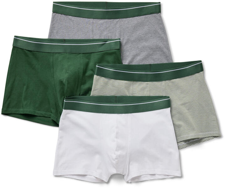 4 db férfi boxeralsó, olíva/szürke/fehér Szín: 1x fehér, 1x melírozott szürke, 1x fehér-olívazöld csíkos, 1x olívazöld Anyag: 95% pamut, 5% elasztán (Creora®) Férfi alsónadrágok rugalmas, kényelmes derékpánttalKétrétegű elülső betétMárkás elasztánnal: formatartó, tökéletesen áll, rendkívül kényelmes viselet GOTS organic – konverziós anyagokból, CU minősített 809415 minősítettEzek a boxeralsók elősegítik a fenntartható gyapottermesztést.