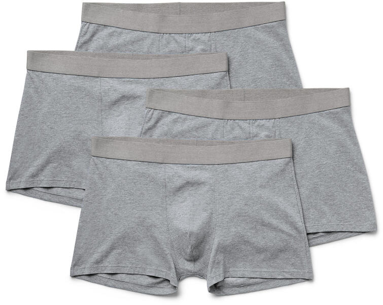 4 db férfi boxeralsó, szürke Szín: 4x melírozott szürke Anyag: 95% pamut, 5% elasztán (Creora®) Férfi alsónadrágok rugalmas, kényelmes derékpánttalKétrétegű elülső betétMárkás elasztánnal: formatartó, tökéletesen áll, rendkívül kényelmes viselet Tartós pamuttalGOTS organic – konverziós anyagokból, CU 809415 minősítettEzek a boxeralsók elősegítik a fenntartható gyapottermesztést. Online 10/4XL méretig is kapható