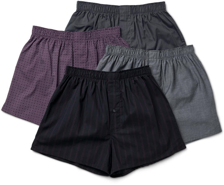 4 db férfi szövött boxeralsó, mintás/szürke Szín: 1x melírozott szürke, 1x bordó csíkos fekete, 1x bordó-fekete-krémszínű nyomott mintás, 1x antracit Anyag: 100% pamut (támogatja a Cotton made in Africa kezdeményezést) Kiváló minőségű, finom pamutszövetFérfi alsónadrágok gombos sliccelRugalmas gumis derékrész, belseje puhán bolyhozottSzárítógépben száríthatókTámogatja a Cotton made in Africa kezdeményezéstEzek a szövött boxeralsók támogatják a termelőket.