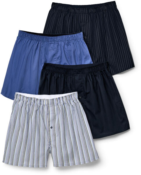 4 db férfi szövött boxeralsó, csíkos/kék Szín: 1x sötétkék, 1x kék, 1x sötétkék-krémszínű csíkos, 1x kék-sötétkék-krémszínű csíkos Anyag: 100% pamut (támogatja a Cotton made in Africa kezdeményezést) Kiváló minőségű, finom pamutszövetGombos sliccRugalmas gumis derékrész, belseje puhán bolyhozottSzárítógépben száríthatókTámogatja a Cotton made in Africa kezdeményezéstEzek a szövött boxeralsók támogatják a termelőket.