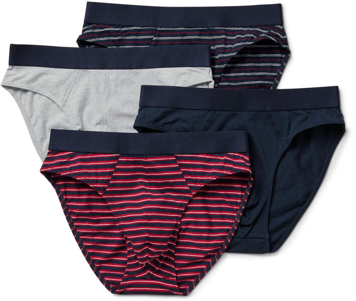4 férfi alsó Szín: 2x kék-piros-fehér csíkos, 1x melírozott szürke, 1x sötétkék Anyag: 95% pamut, 5% elasztán (Creora®) Különösen lapos, rugalmas derékpánt puhán bolyhozott belsővelKellemesen puha pamut-sztreccs anyag Kétrétegű elülső betétMárkás elasztánnal: formatartó, tökéletesen áll, rendkívül kényelmes viseletTartós pamuttalGOTS organic – konverziós anyagokból, CU 809415 tanúsítottEzek az alsók elősegítik a fenntartható gyapottermesztést.