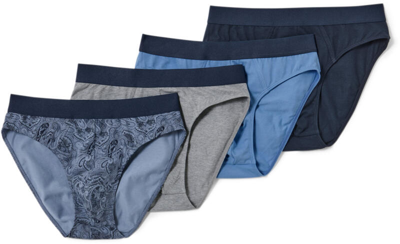 4 férfi alsó, paisley Szín: 1x kék-sötétkék-szürke nyomott minta, 1x melírozott világosszürke, 1x kék, 1x sötétkék Anyag: 95% pamut, 5% elasztán (Creora®) Különösen lapos, rugalmas derékpánt, belseje puhán bolyhozottKellemesen puha pamut-sztreccs anyag Kétrétegű elülső betétMárkás elasztánnal: formatartó, tökéletesen áll, rendkívül kényelmes viseletTartós pamuttalGOTS organic, CU 809415 tanúsítottEzek az alsók elősegítik a fenntartható gyapottermesztést.